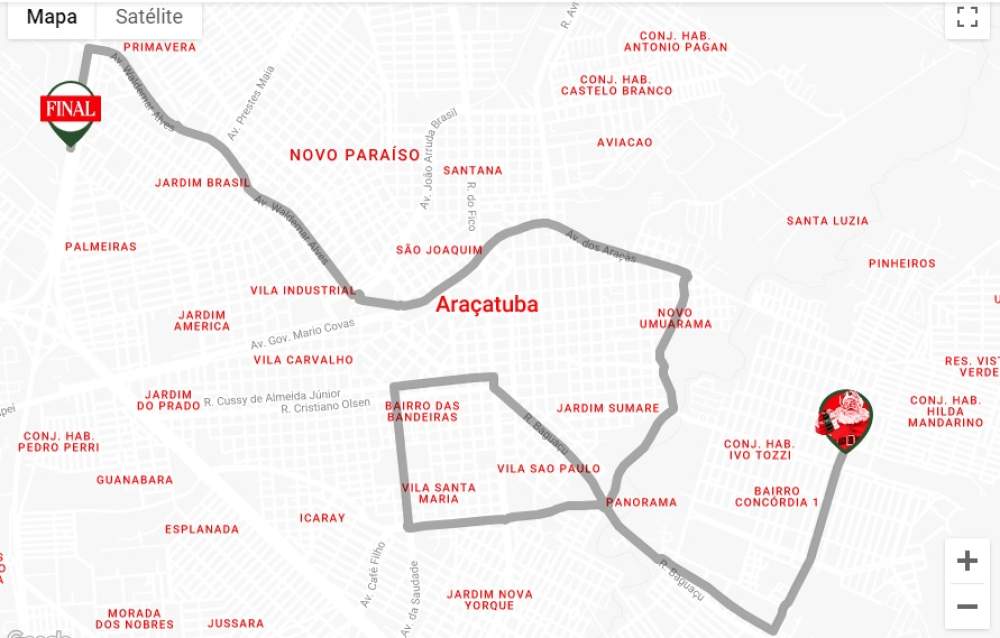 De lá, seguirá pela avenida José Telles de Menezes, sentido ao Hospital Unimed, passará pelas ruas São Caetano, Baguaçu, pela avenidas Pompeu de Toledo, Saudade e retorna, passando pela Cussy de Ameida até a Baguaçu, depois a Waldir Felizola de Moraes, Fundadores, Araçá e Waldemar Alves, até chegar na unidade da empresa em Araçatuba, na marginal da rodovia Elyeser Montenegro Magalhães (SP-463).