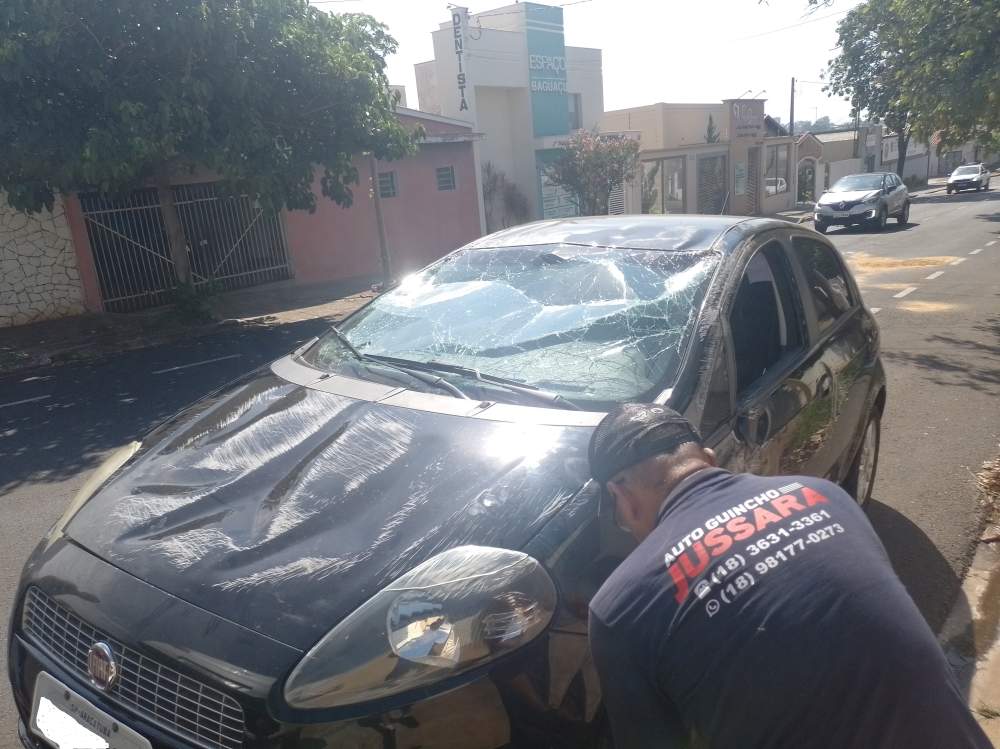 Na manhã desta segunda-feira (13), o condutor de um Fiat Punto perdeu o controle de direção e capotou com o veículo após bater em outro carro estacionado, na rua Baguaçu, em Araçatuba (SP).
