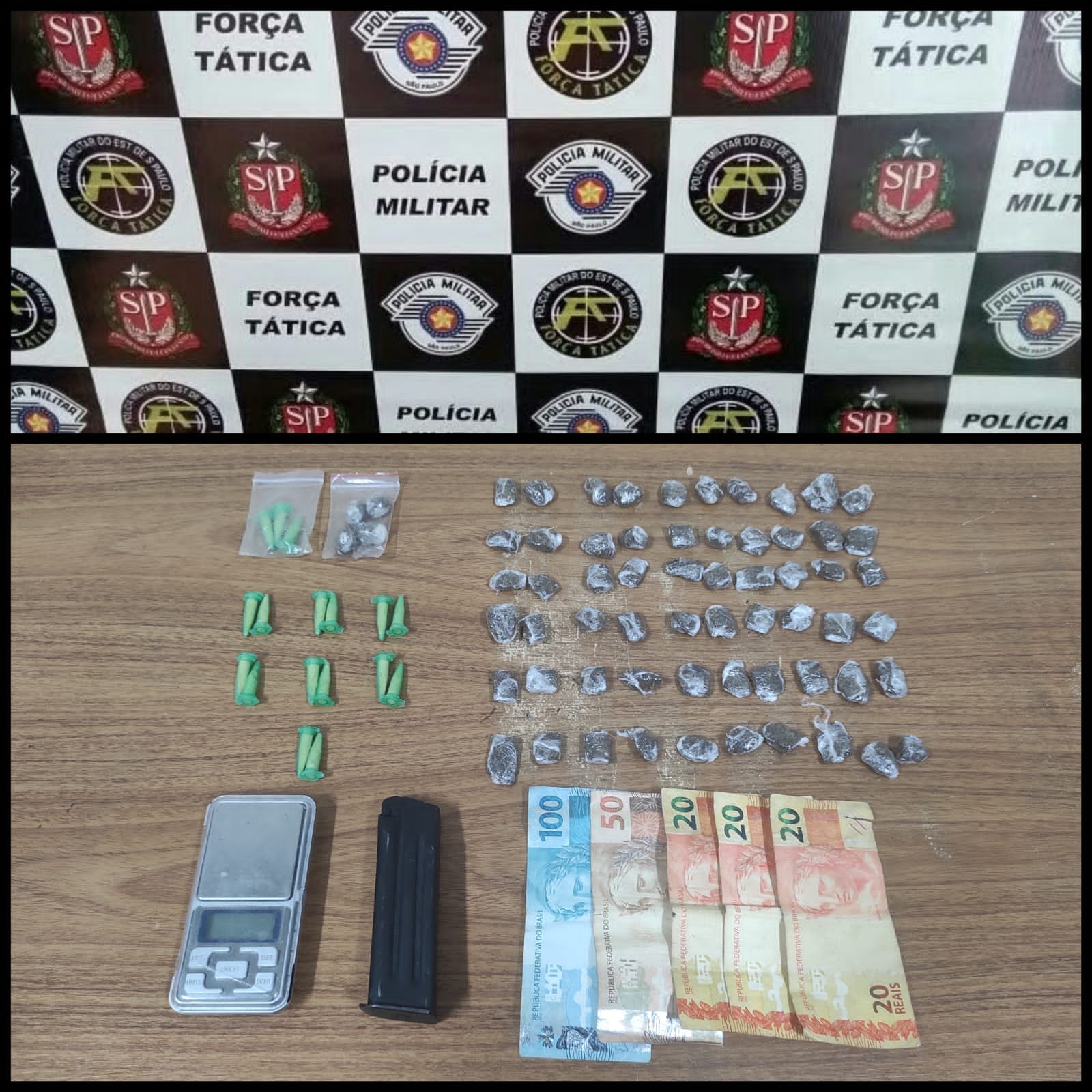 Durante a busca pessoal, as autoridades apreenderam um total de 65 porções de maconha, bem como 17 microtubos contendo cocaína, um montante de R$ 210,00, uma balança de precisão e um carregador de pistola.