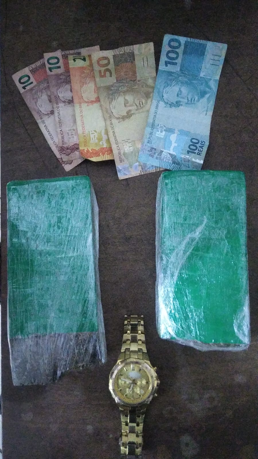 Diante do comportamento suspeito, os policiais decidiram realizar a abordagem. Durante a revista, encontraram dois pacotes de maconha, popularmente conhecidos como “tijolos de maconha”, e a quantia de 190 reais em dinheiro.