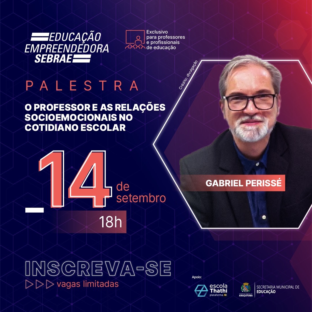 Na próxima quinta-feira (14), o Sebrae e a Prefeitura de Araçatuba, realiza a palestra “O professor e as relações socioemocionais no cotidiano escolar”, com o professor, palestrante, tradutor e escritor brasileiro Gabriel Perissé.