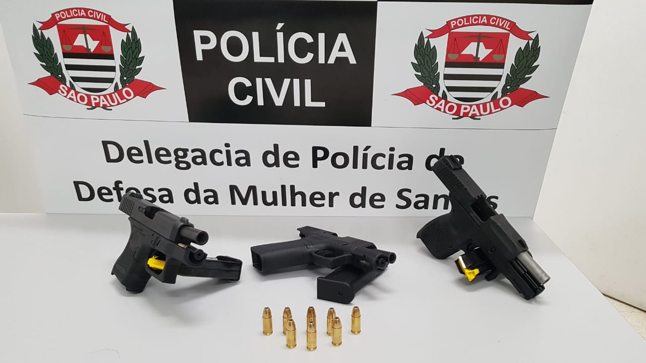 Três pistolas foram encontradas dentro de uma residência em Santos e apreendidas pela equipe da Delegacia de Defesa da Mulher (DDM) de Santos. Elas seriam usadas para que o homem de 46 anos provocasse ameaças de morte contra a própria esposa, de 36.
