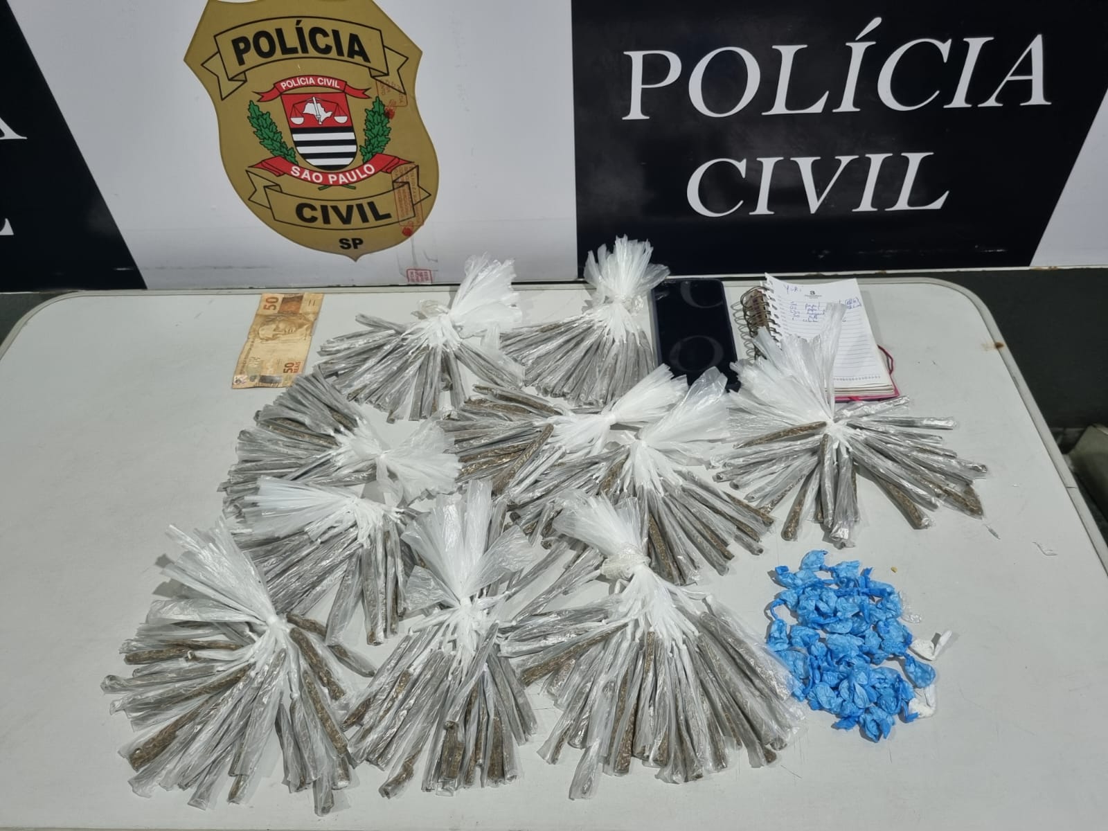 Nas buscas, os policiais encontraram 234 porções de maconha e 52 papelotes de cocaína. Além disso, uma caderneta com anotações acerca da venda de drogas e a quantia de R$ 50. O aparelho celular do investigado também foi apreendido. Ele foi conduzido à unidade policial e preso em flagrante por tráfico de drogas.