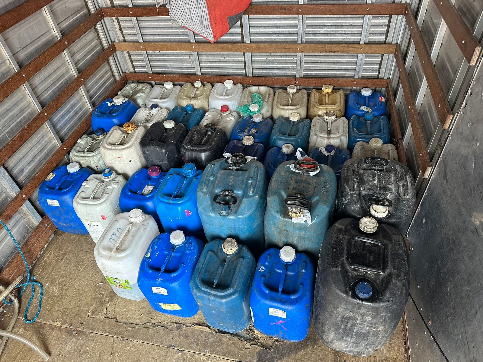 A equipe fez a busca e conseguiu deter o acusado. Ao entrarem no imóvel, os policiais encontraram 31 galões com combustíveis, mangueiras e funis utilizados para o manuseio da gasolina. Além disso, o veículo utilizado no transporte desse material também foi apreendido.