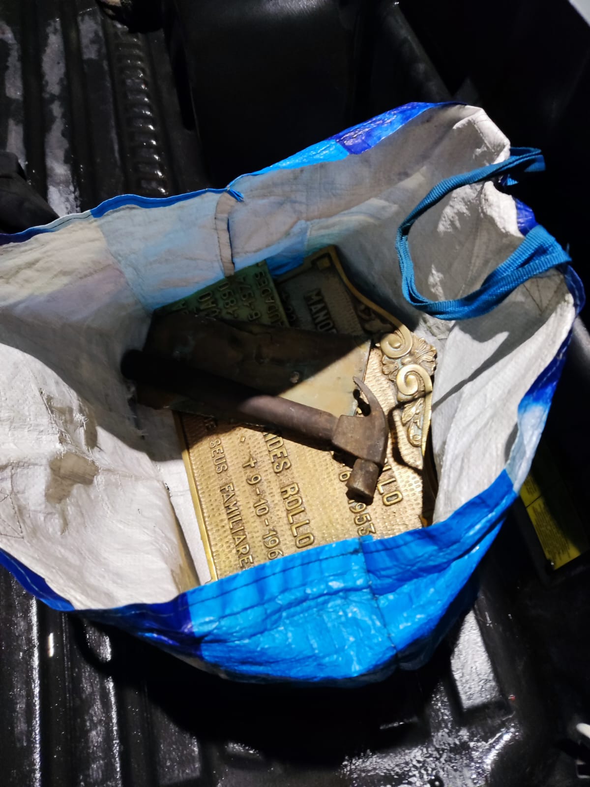 A guarnição saiu em perseguição e deteve o acusado. Na sacola, foram encontradas 11 placas de bronze, apreendidas pelos guardas municipais. O suspeito foi preso e encaminhado à delegacia, ficando à disposição da justiça.