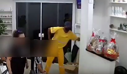As câmeras de monitoramento flagraram a ação do bandido que entra no estabelecimento, onde uma mulher cortava o cabelo de uma criança, coloca a mão na cintura, como se fosse puxar uma arma, pega um objeto e o esconde no bolso. Em seguida, ele abre uma gaveta e pega um celular.