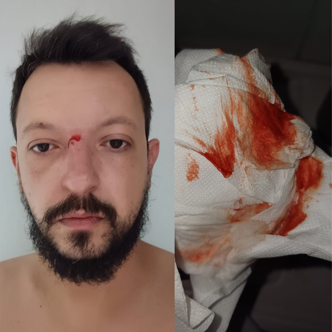 De acordo com a vítima, o jornalista Geoffrey Scarmelote, a confusão começou por conta das fezes do cachorro dele, que teriam irritado o suposto agressor. “Estava passeando com o meu cachorro e ele fez cocô. Eu estava sem sacola. E eu nem tinha visto que ele fez cocô, porque ele (o cão) foi para longe, na esquina de uma colônia de férias que tem aqui”.
