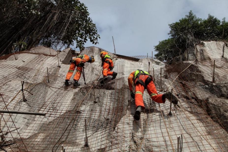 “Após os processos de escavações, o talude será protegido e estabilizado, com a execução de solo grampeado, ancorado em rocha, e de solo verde em uma área de 1.250 m².”