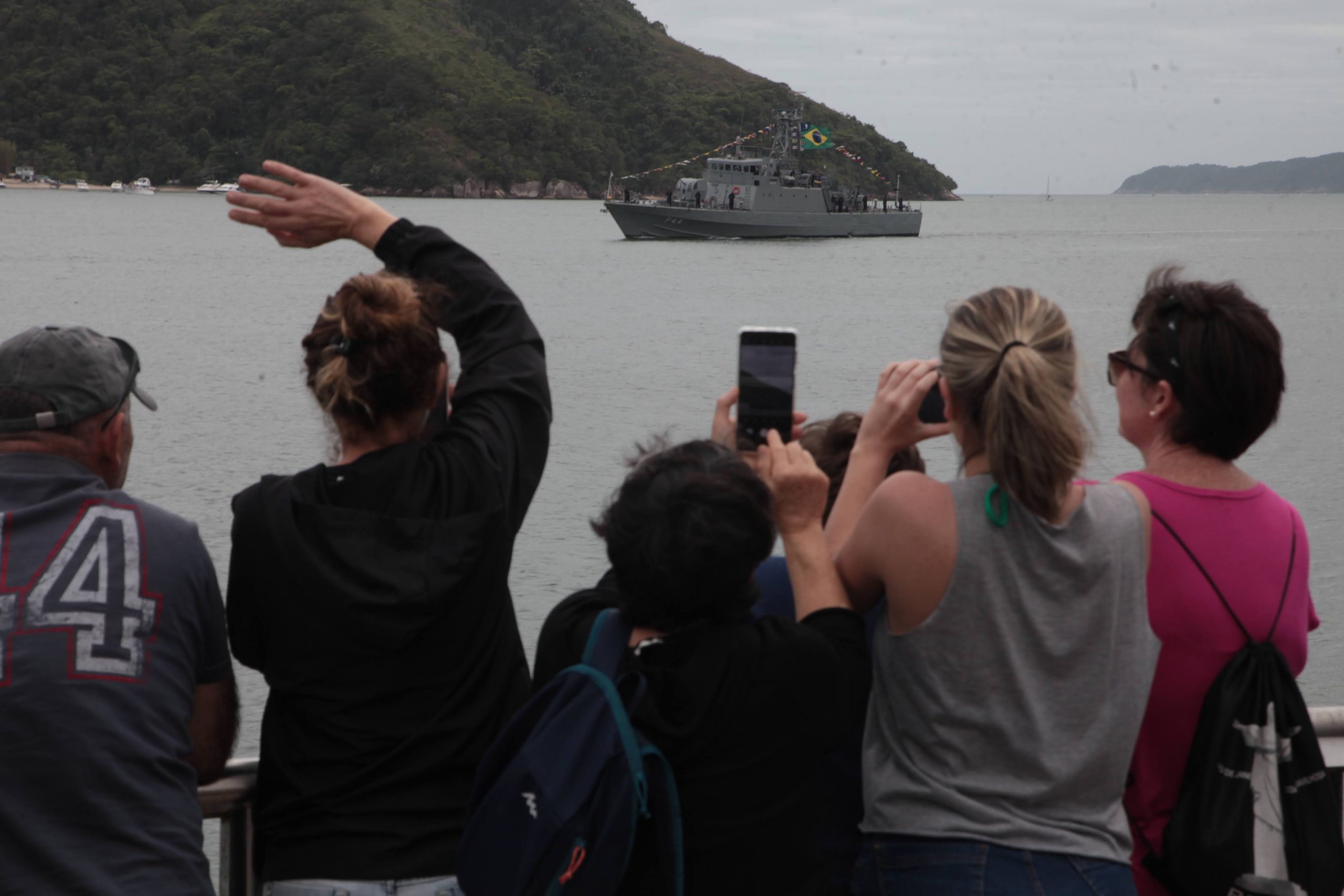 A principal concentração do público foi no Deck do Pescador. Ali, tanto santistas, como turistas fizeram questão de parar e acompanhar a passagem de dois navios de guerra, um Aviso de Patrulha e duas embarcações de casco rígido da Marinha do Brasil, além de uma barcos do Grupamento de Bombeiros Marítimos, da Polícia Militar e da Guarda Portuária.