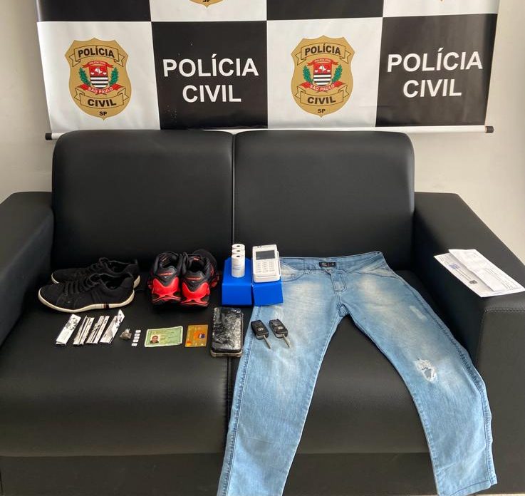 No imóvel, foram apreendidos cinco chips de telefonia celular, uma maquininha de cartão, bobinas de papel, documento, cartão bancário e um aparelho telefônico deliberadamente danificado pelo investigado.