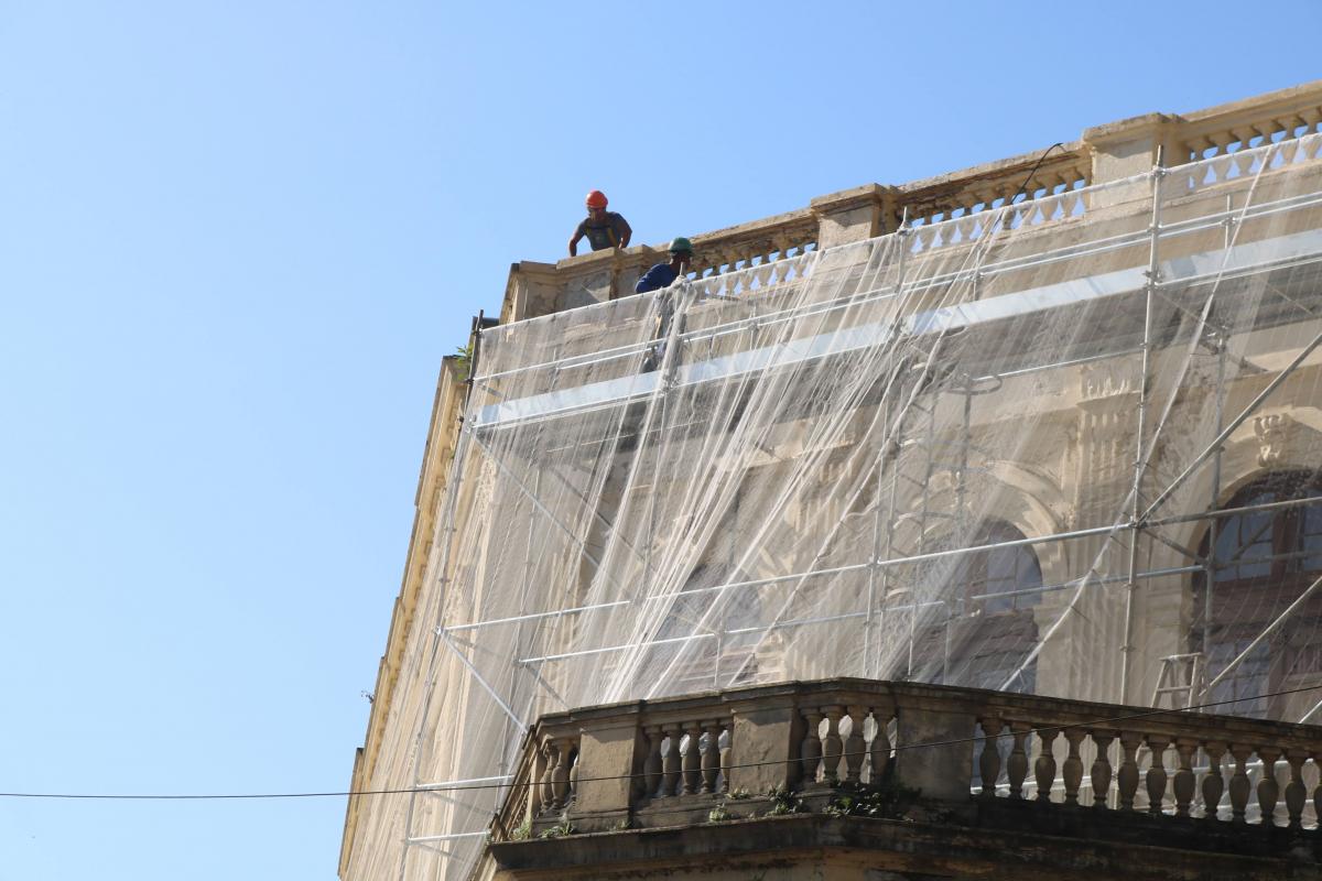 O serviço de restauro da entrada do edifício histórico teve início com a remoção da tinta da parte inferior da parede, passando agora para a parte superior.