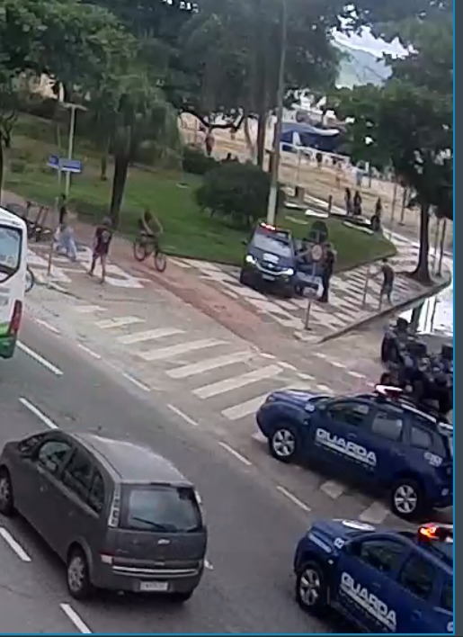 Os guardas passaram a monitorar o local quando, poucos minutos depois, o suspeito passou de bicicleta em alta velocidade. Uma viatura da GCM que estava estacionada saiu na captura, mas outra equipe utilizando quadriciclos conseguiu detê-lo próximo da Concha Acústica.