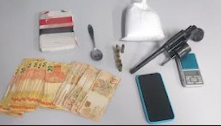 A Polícia Militar percebeu um rapaz em atitude suspeita e realizou a abordagem. Com ele nada foi encontrado, mas na residência do suspeito foram localizadas várias porções de cocaína, uma balança utilizada no tráfico de drogas, R$ 1.600,00 em dinheiro e um revólver calibre 32 com as munições intactas.