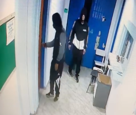 Imagens de segurança flagram o momento que os suspeitos circulam pela escola, e entram nas salas com uma lanterna. Depois de um tempo, eles percebem a presença da câmera de monitoramento e tentam impedir a filmagem.