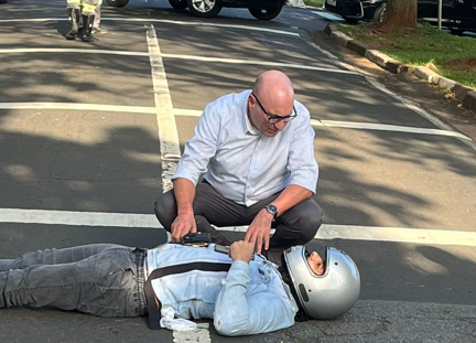 Um motociclista que passava pela Avenida Heitor Penteado, na manhã desta quinta-feira (11/05), bateu em um carro que saia da garagem. O homem de 27 anos, foi socorrido pelo prefeito Dário Saadi que passava pelo local.