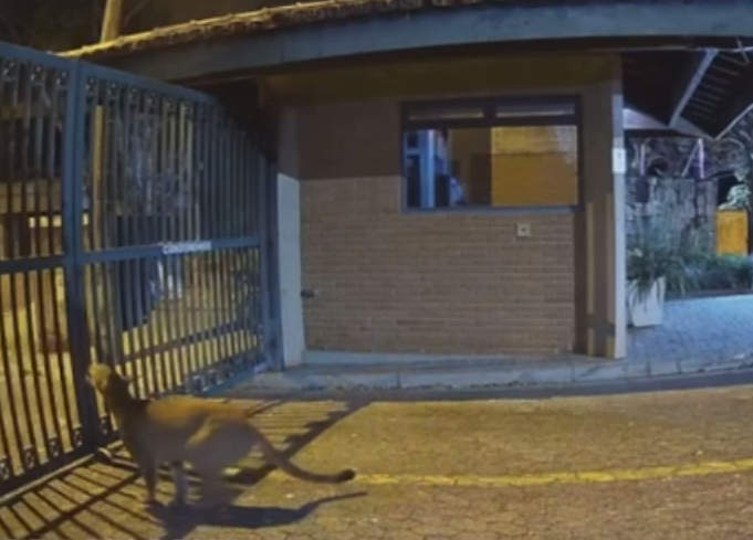 Onça-parda é flagrada caminhando pelas ruas do bairro Gramado, em Campinas. Uma câmera instalada na rua Eliseu Teixeira de Camargo registrou imagens do animal. Em uma outra imagem, a onça pula o portão e invade um condomínio.