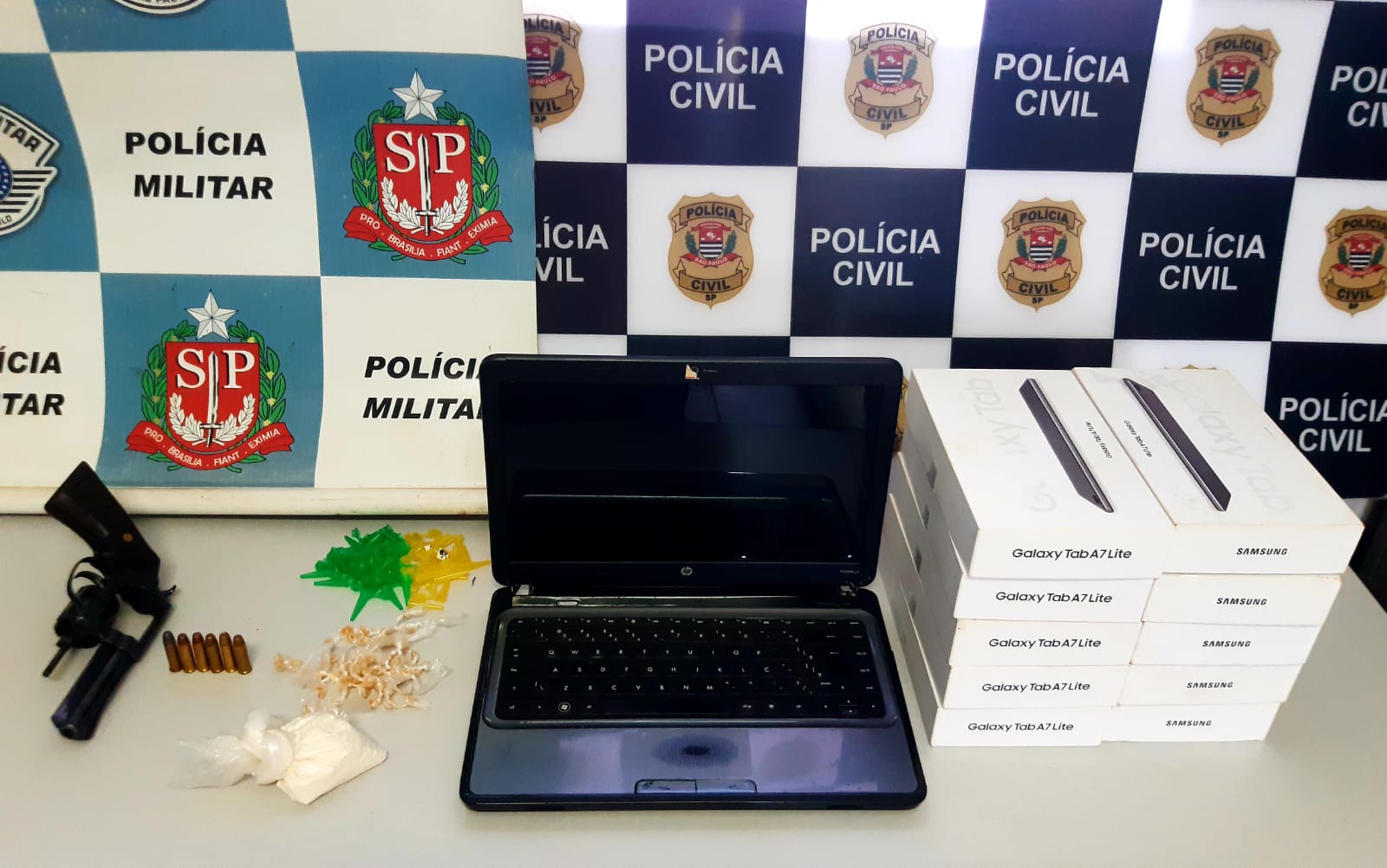 Ao todo foram levados 108 tablets, da marca Samsung. Os policiais conseguiram encontrar 27 em poder dos suspeitos, além de um revólver calibre 38, carregado com seis munições, 60 pedras de crack e aproximadamente 65 gramas de cocaína.