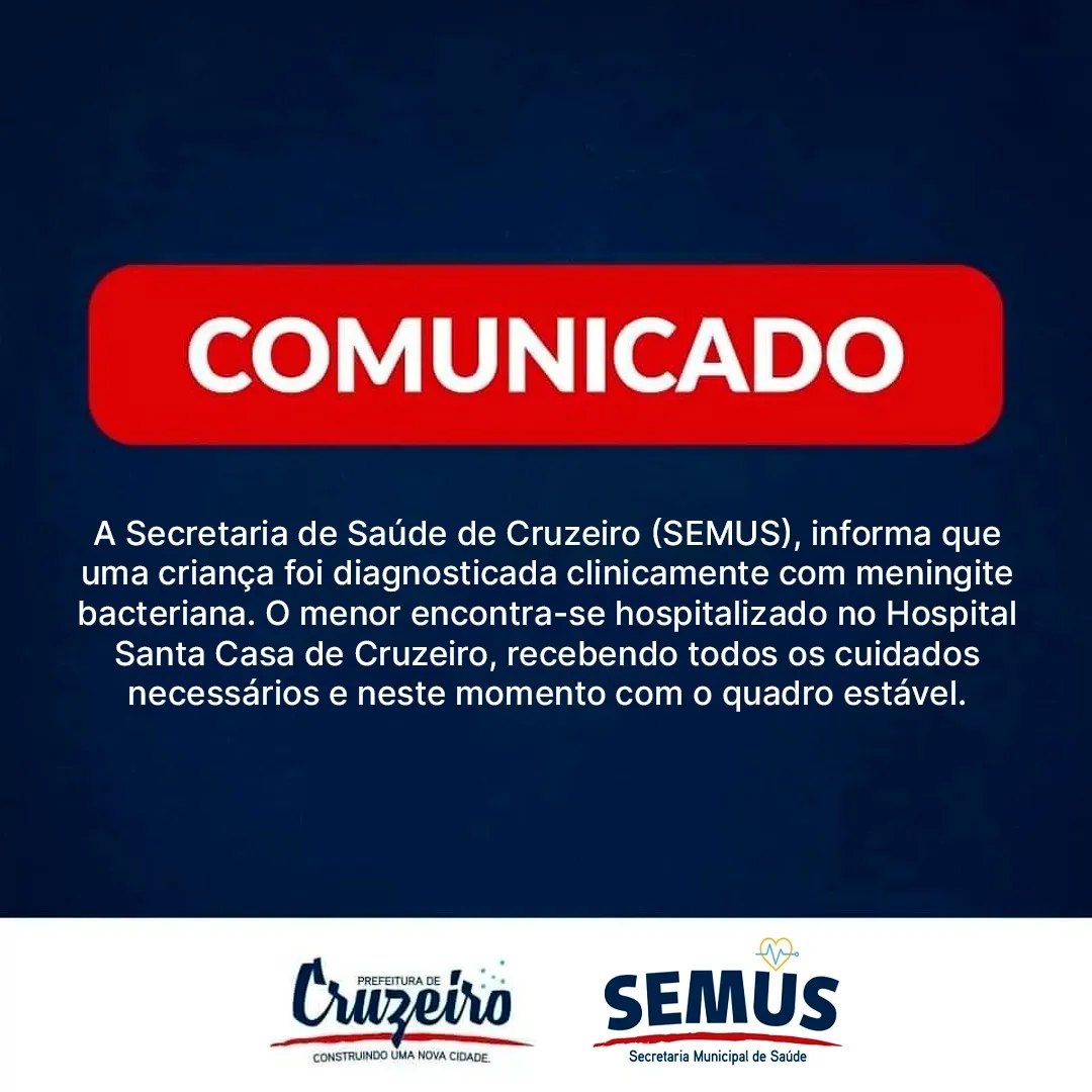 Um menino de 4 anos foi diagnosticado com meningite bacteriana, em Cruzeiro. A informação foi confirmada pela Prefeitura da cidade, na última quinta-feira (19).