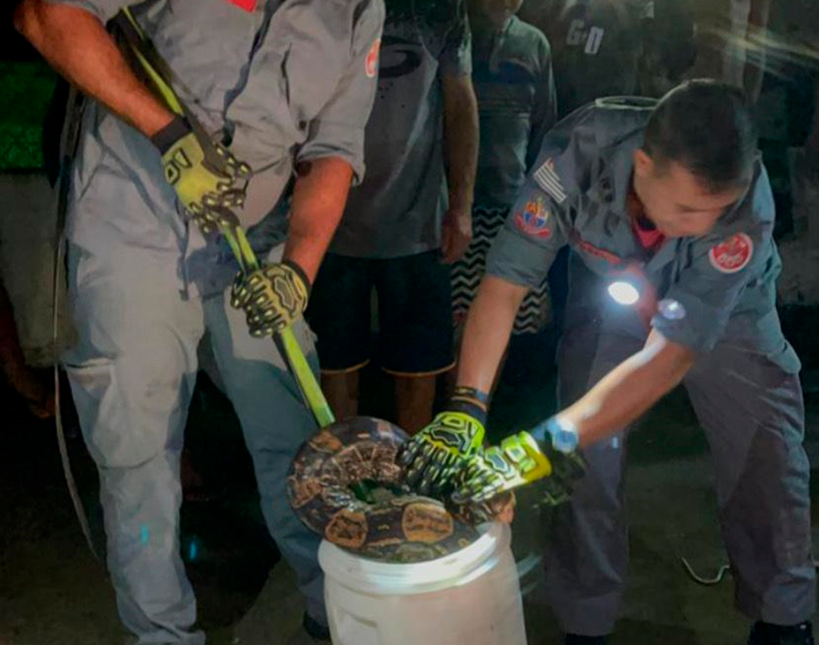 Uma cobra jiboia de quase três metros de comprimento foi resgatada pelo Corpo de Bombeiros em uma rua no bairro Taquaral, na cidade de Ubatuba, na última terça-feira (9).