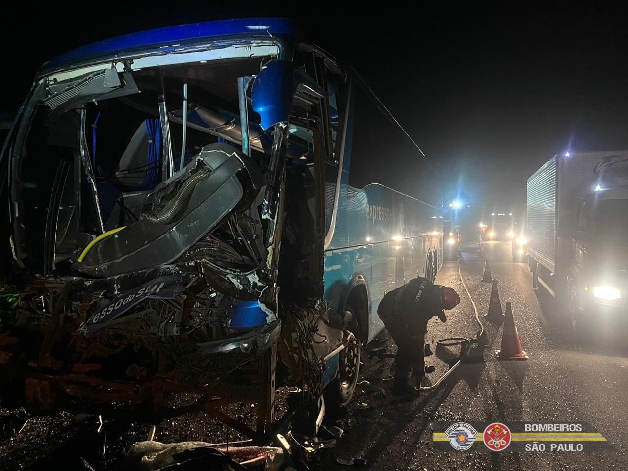 Motorista de ônibus ficou preso nas ferragens após acidente com um caminhão, na Rodovia Presidente Dutra, em Cachoeira Paulista, na madrugada desta segunda-feira (30).