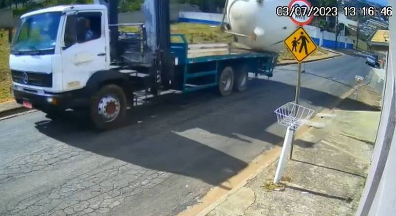 Imagem de câmera de segurança mostra o momento em que o tanque se solta da carroceria, enquanto o caminhão sobe a avenida, e desce a via rolando.
