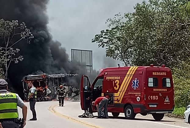 Após a colisão, o ônibus pegou fogo e foi totalmente consumido pelas chamas. Estavam dentro do veículo, cerca de 20 passageiros, que conseguiram sair a tempo e sem ferimentos.