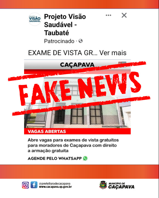 A Prefeitura de Caçapava, por meio da Secretaria de Saúde, informa que está circulando nas redes sociais uma informação falsa sobre consulta e vagas para exames oftalmológicos. A informação não procede, é Fake News.